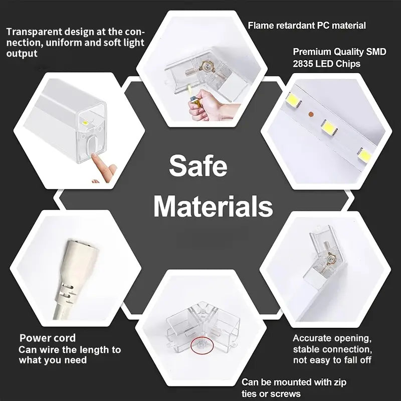 Consisting of different length aluminum and polycarbonate LED light tubes and various types of connectors, you can experiment with layouts that are best suited to your specific needs. You could choose to stick with the suggested layout, or use the elements in the package to create a pattern that truly reflects your style and the character of your space.
